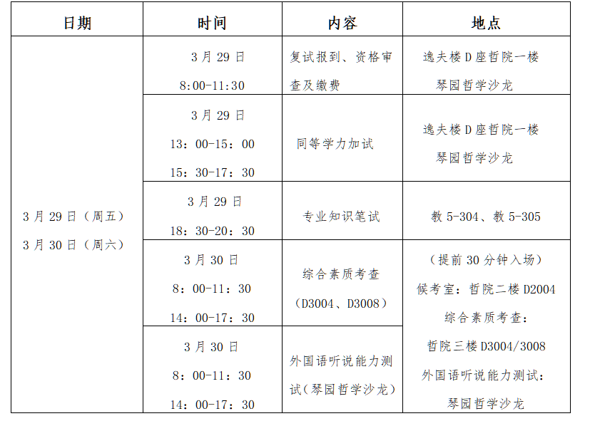 学院采用现场复试方式组织复试,复试由专业知识笔试、英语听说能力测试、综合素质考查三项组成。复试每项满分均为100分,60分以上为合格。考生复试成绩每项不得低于60分,否则不予录取。同等学力考生须加试两门专业课。加试课程的成绩不计入复试成绩,但不合格者不予录取。