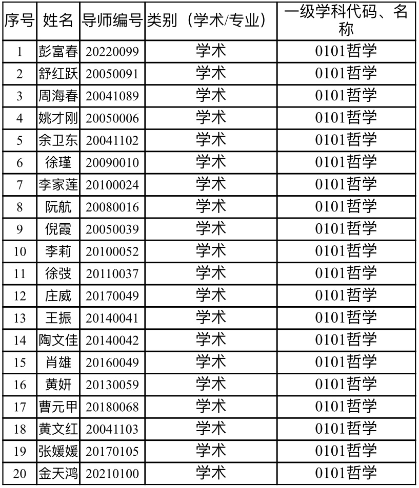 根据《关于印发<湖北大学教师申请招收博士研究生审核办法(修订)>等三个文件的通知》(校研字﹝2019﹞8号),经365英国上市公司分学位评定委员会全体委员审议表决,认定彭富春、舒红跃等20名教师具备2024年招收学术硕士研究生资格。现将结果公布如下: