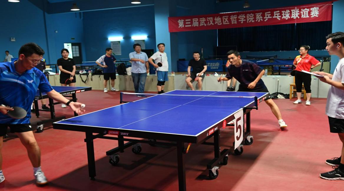 第二阶段是乒乓球联谊赛。课程思政交流会结束后,四校哲学院系老师一同前往3号体育馆进行“第三届武汉地区哲学院系乒乓球联谊赛”。四所哲学院系师生分别代表四支队伍参赛。本次比赛项目分为团体赛与个人赛,且均采取淘汰赛制。相较于上一届联谊赛,本届联谊赛多了华中师范大学哲学系队的加入,使得我们的活动更加精彩,也为最终比赛结果带来了很大变数。