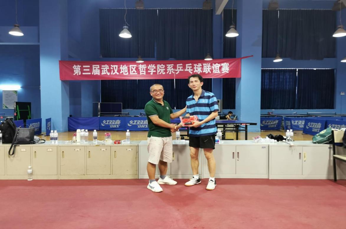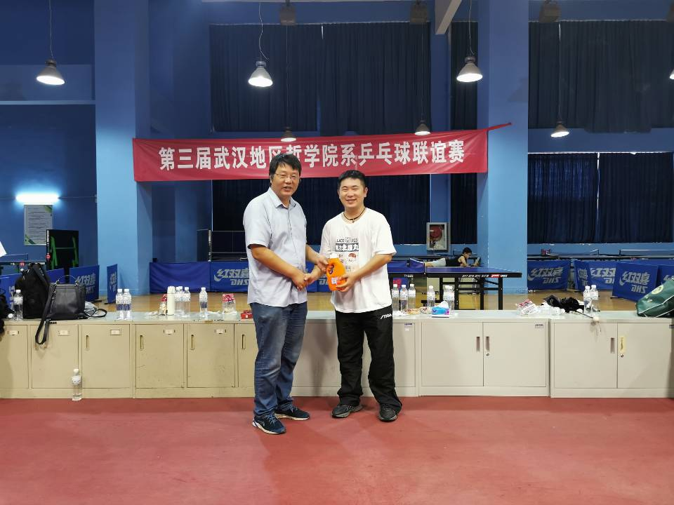 乒乓球联谊赛的个人比赛,此次报名的选手有22名,分别来自四个院系。为了比赛的公平性,本届比赛将上一届比赛的前四名分别置于四个分赛区,以抓阄的方式决定;除了上一届的前4名,剩余的18位选手需要随机抓取自己的席位。通过不断的淘汰赛,最终武汉大学的翟志宏老师、葛四友老师,华中师范大学的谢从高老师,湖北大学的董力老师,进入本届联谊赛前4名。经过半决赛的激烈比拼,最终,翟志宏老师与葛四友老师争夺季军,谢从高老师与董力老师进入决赛。在最后的决赛中,谢老师与董老师展现了高超的技术与体能,整个过程精彩纷呈,掌声不断。最后,董力老师以3:1的大比分拿下冠军,为学院争得殊荣。