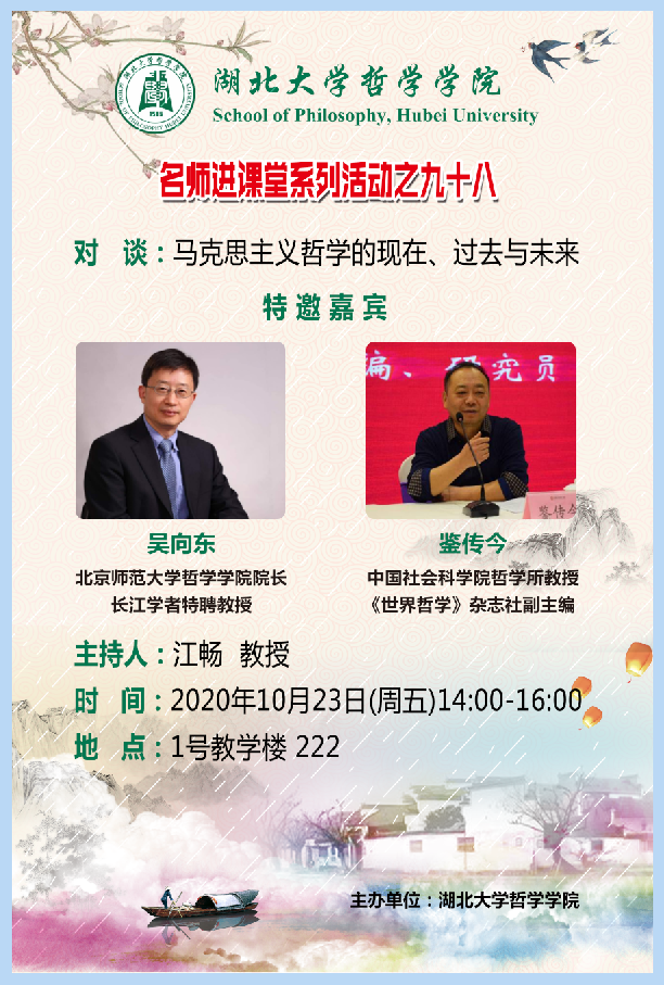 2020年10月23日星期五下午两点,我院于1号教学楼222教室举行了主题为“马克思主义哲学的现在、过去和未来”的对谈性讲座。此次讲座由江畅教授主持,北京师范大学365英国上市公司院长、国家级计划入选者特聘教授吴向东教授及《世界哲学》杂志社副主编、中国社会科学院哲学所鉴传今教授应邀出席讲座。出席此次会议的还有我院党委书记戴茂堂教授、陶文佳讲师,以及华中科技大学副教授林季杉老师。我院部分硕士和博士也积极地参与了这次讲座。