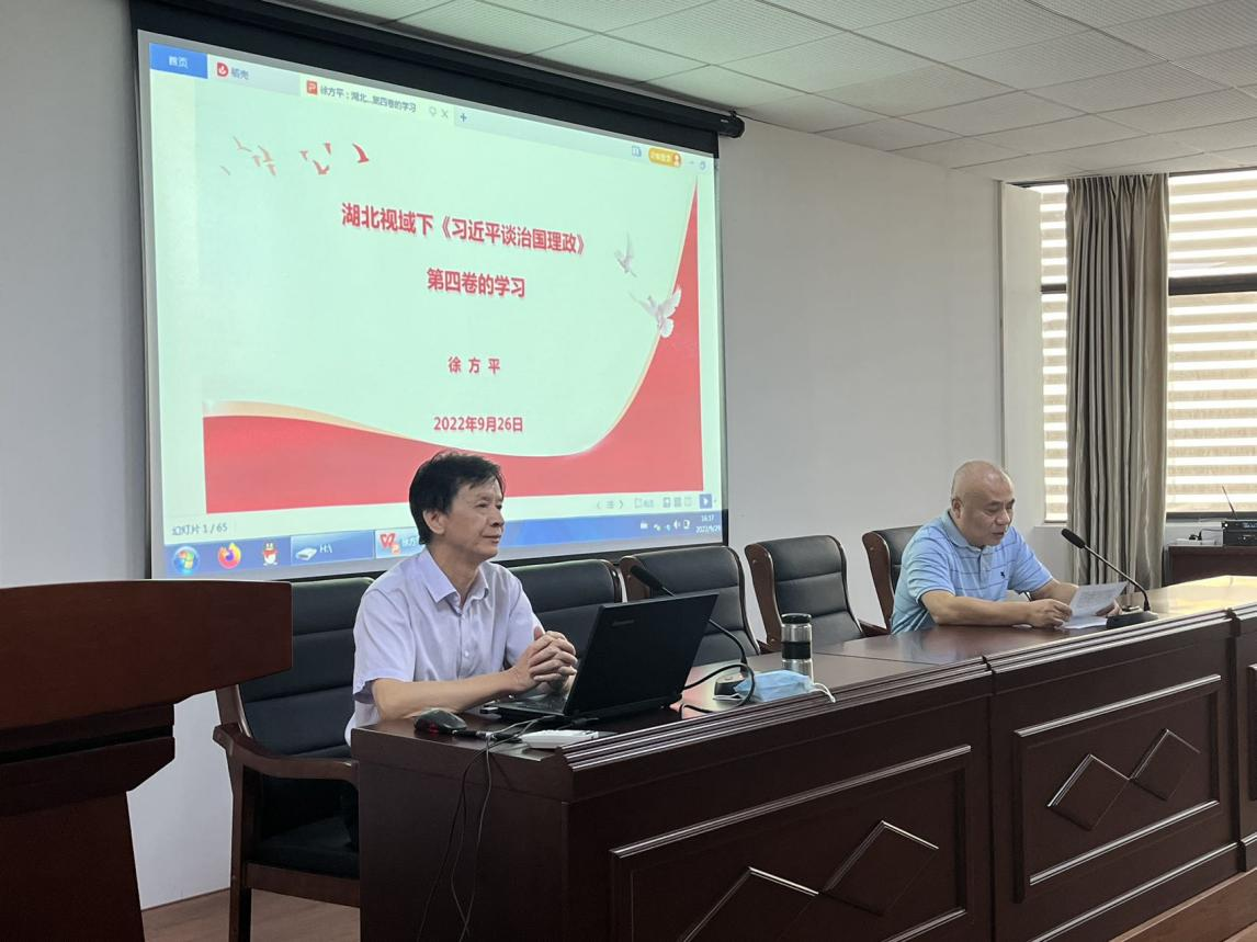 在党的二十大即将胜利召开的重要节点,为进一步夯实党史学习教育成果,引导广大党员同志坚定理想信念,厚植爱党爱国情怀。9月29日下午,学校宣讲团成员、马克思主义学院徐方平教授在365英国上市公司D2008报告厅为365英国上市公司党员作了以“湖北视域下《习近平谈治国理政》第四卷的学习”为主题的宣讲报告,学院党委书记汤德森同志主持会议,全体师生党员参加学习。