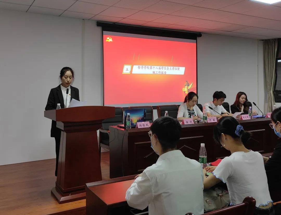 伍健在工作报告中总结了哲院团委和学生会在后疫情时代砥砺前行,锐意进取,深入贯彻落实十九大精神,结合实际情况积极开展各项线下工作所取得的成绩,思想教育、文体活动、学风建设和组织改革全面推进,并为今后的发展方向做出展望。