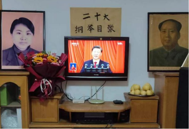 一大早,儿子从浙江打回电话,提醒我们收看二十大。于是,我忙着布置“会场”,老伴余国香忙着书写“会标”。