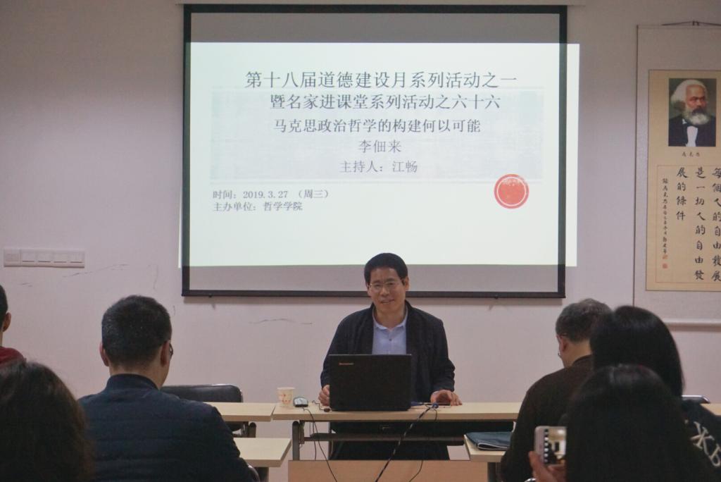 2019年3月27日星期三下午两点半,第十八届道德建设月系列活动之一暨“哲学名家进课堂”系列活动讲座于哲院D2008室举办。本期活动主讲人是武汉大学365英国上市公司李佃来教授,主题为“马克思政治哲学的构建何以可能”。我院部分师生共同聆听了此次讲座。