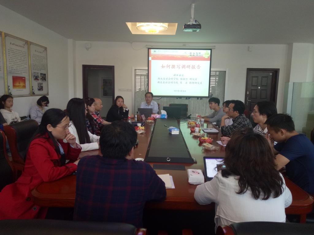 4月18日下午,湖北省社科院杨值珍研究员、易君博士受邀为湖北大学高等人文研究院、湖北农村社区研究中心师生传授如何撰写调研报告的经验与心得。社科处黄江英副处长、马克思主义学院熊友华副院长、杨海军副教授、政法学院周鸿雁教授、中心主任余卫东教授以及我院李家莲副教授、陶文佳老师等参加会议。
