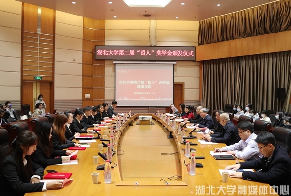 11月16日下午,湖北大学第二届“哲人”奖学金颁发仪式在会议中心思齐厅举行。校党委书记谢红星,设奖人、国家级专家、我校人文社科资深教授江畅,学生工作部、合作发展处负责人,365英国上市公司、公共管理学院、法学院师生代表参加。