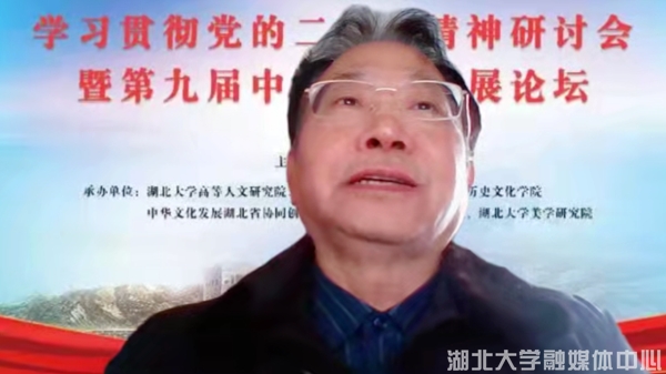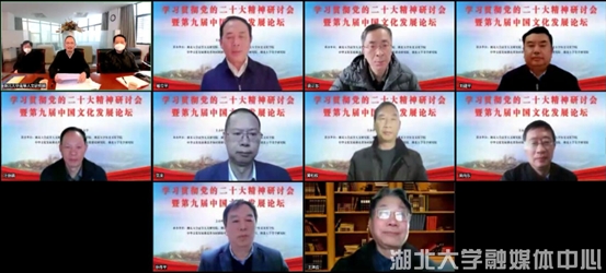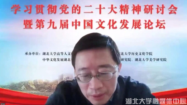 12月16日,学习贯彻党的二十大精神研讨会暨第九届中国文化发展论坛在湖北大学举行。湖北省社会科学界联合会党组书记喻立平,湖北大学党委副书记、校长刘建平,湖北大学人文社会科学资深教授彭富春、江畅出席论坛。武汉大学人文社会科学资深教授汪信砚、北京师范大学吴向东教授、南京大学唐正东教授、吉林大学贺来教授、湖南师范大学王泽应教授、上海大学孙伟平教授、湖北大学黄柏权教授等知名学者通过线上的形式出席会议,并围绕“中国文化发展与中国式现代化”论坛主题进行主旨报告。