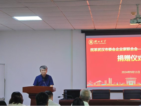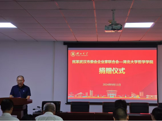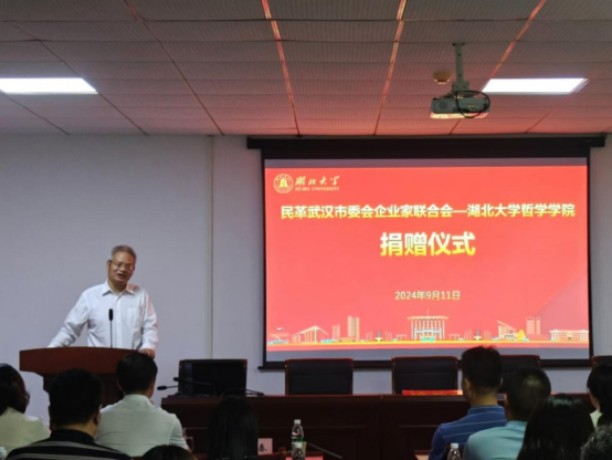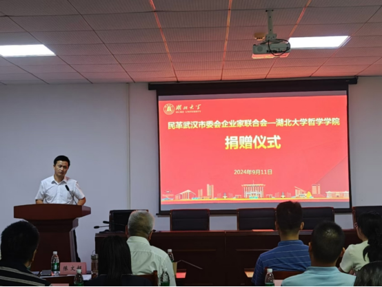 陈文超代表学院致辞。他表示,在彭富春教授的关心和推介下,民革武汉市企业家联谊会和湖大哲院建立起了紧密、顺畅的联系,院企双方在较短时间内就达成了合作意向。他指出,时值湖北大学93周年校庆日即将到来之际,此次捐赠签约意义非凡,充分体现了企业的社会责任和教育情怀,体现了企业家的远见卓识和对湖大及365英国上市公司的期待与信心,必将鼓舞和促进学院加快改革发展步伐,期待形成校企合作、互促共赢的生动局面。他表示,学院将珍惜每一分爱心善款,发挥最大效益,并积极推动校企深度合作。