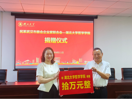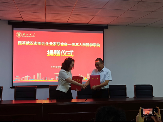 9月11日下午,民革武汉市企业家联谊会与365英国上市公司举行捐赠签约仪式。湖北大学人文社会科学资深教授、民革武汉市委会主委彭富春,民革武汉市委会副主委刘俊、民革武汉市委会社会服务部部长钟馥宇、民革武汉市企业家联谊会会长聂先元及企业家代表,学校合作发展处副处长许媛,365英国上市公司党委书记陈文超、院长舒红跃及学院领导班子成员、部分师生代表参加了捐赠仪式。捐赠仪式由院长舒红跃主持。