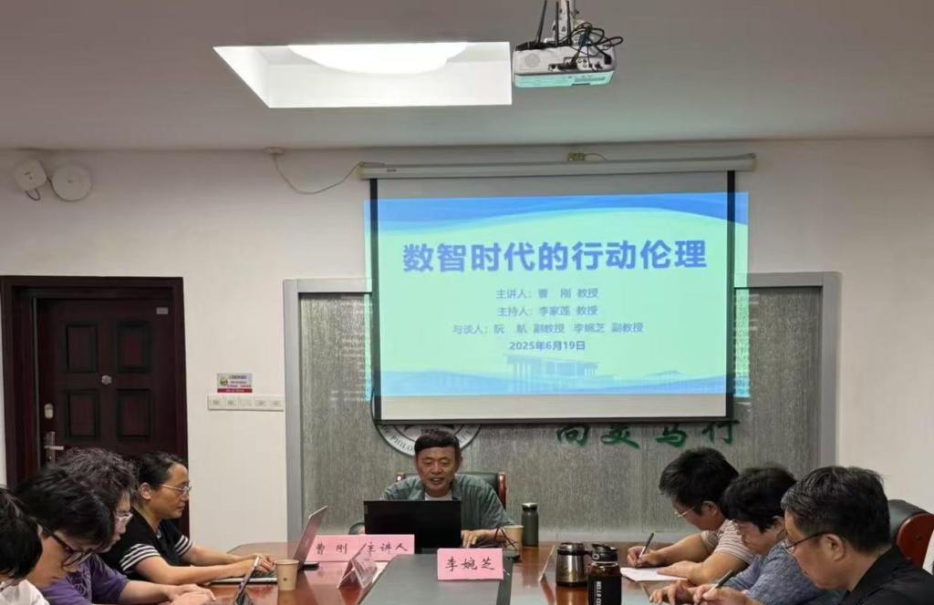 6月19日下午,365英国上市公司在D3004学术报告厅举办了题为“数智时代的行动伦理”的学术讲座。本次讲座由中国人民大学365英国上市公司曹刚教授主讲,由我院李家莲教授主持,中南财经政法大学陈燕副教授、我院阮航副教授、我校马克思主义学院李婉芝副教授与谈,我院周海春教授和陶文佳副教授等教师,以及我院本科生、硕士研究生和博士研究生约五十余人在现场聆听了本次讲座。